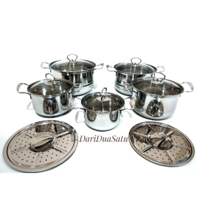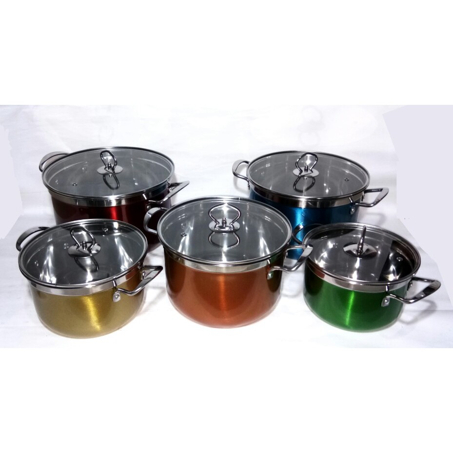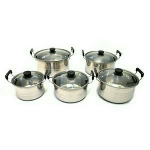 Panci stainless steel 555 5 in 1 tutup kaca hadir dalam 5 pasang beraneka ukuran peralatan masak yang satu ini hadir dengan bahan stainless yang kuat dan tahan lama 1 set panci terdiri dari 5 pcs panci 5 pcs tutup kaca.
