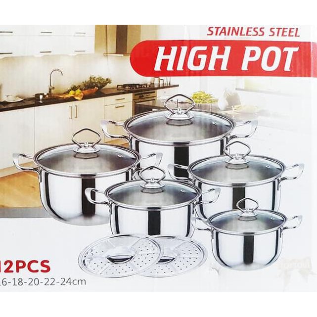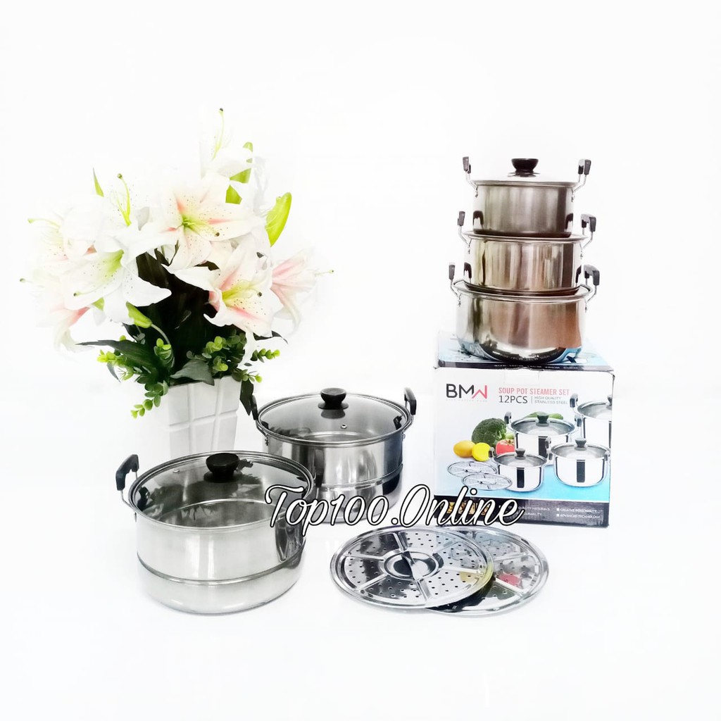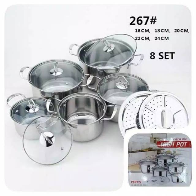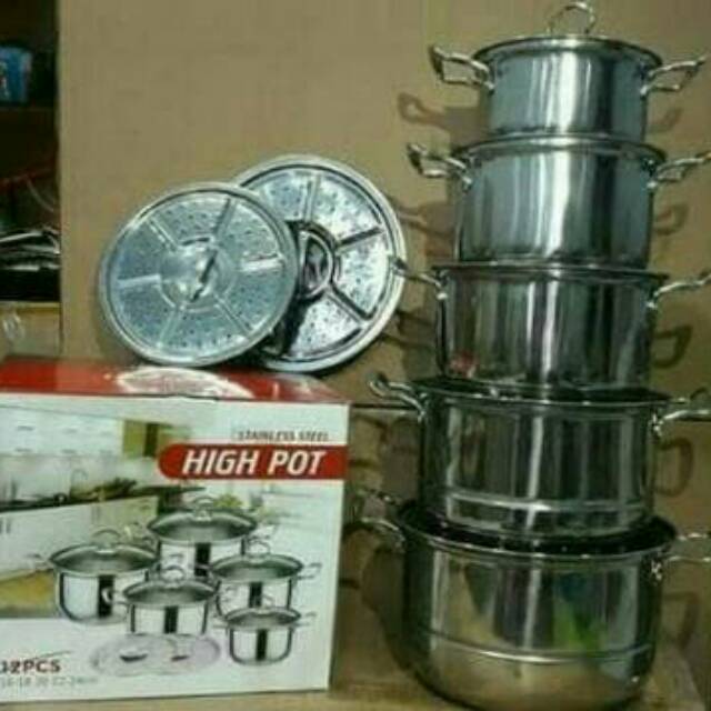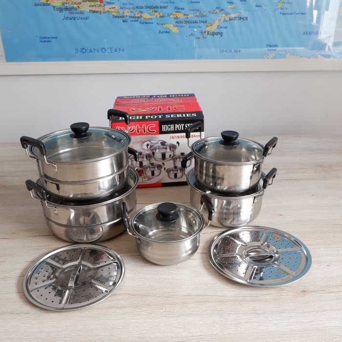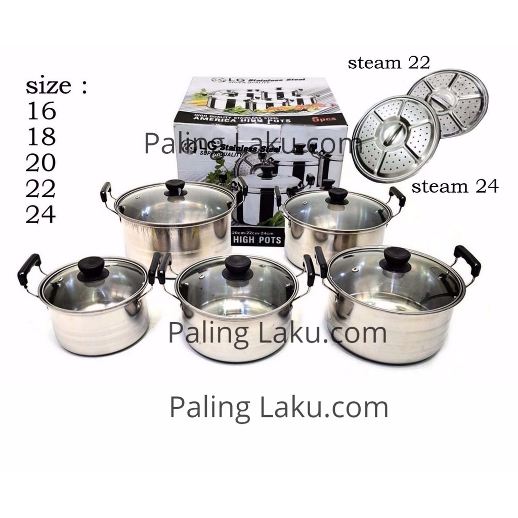 Awet dan anti karat. Panci terdiri dari 5 ukuran ukuran terbesar 1 dan 2 memiliki steamer. Bekasi rajawali gajah purnama. Jual panci high pot steamer stainless steel tutup kaca 1 set 10 pcs dengan harga rp215 000 dari toko online setiadi 123 jakarta barat.